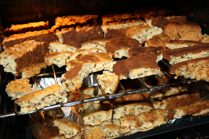 8. Place separated rusks on oven racks and dry out overnight at 100°C. Insert a wooden clothes peg to keep oven door slightly open. Make sure the bottom rack has a large baking sheet on it, to catch crumbs – when crumbs hit the element of the oven it fills the kitchen with a burning smell.